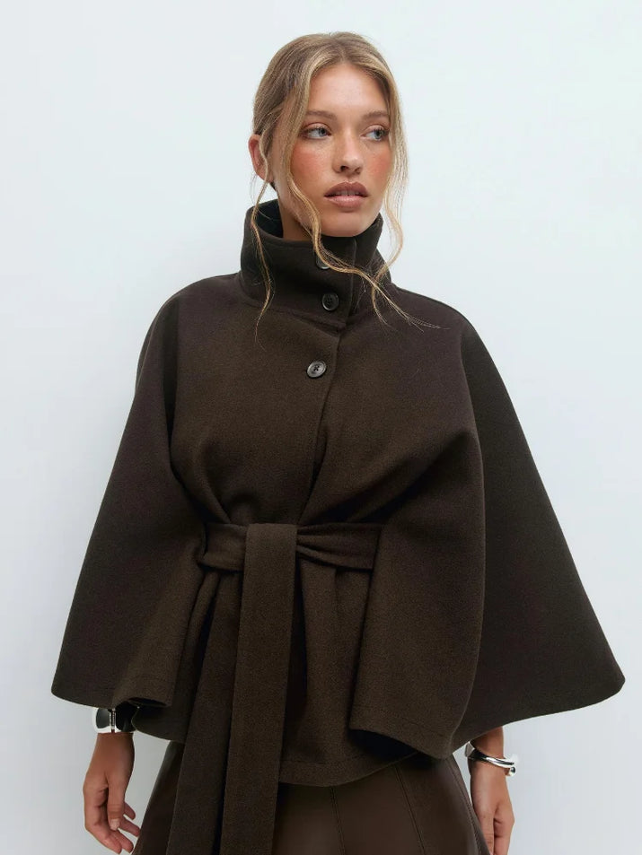 Fashion Solid Stand Collar Short Jacket Women Elegant Flared Sleeve Buttoned Lace Up Coats 2025 Autumn Lady Office Street Wear