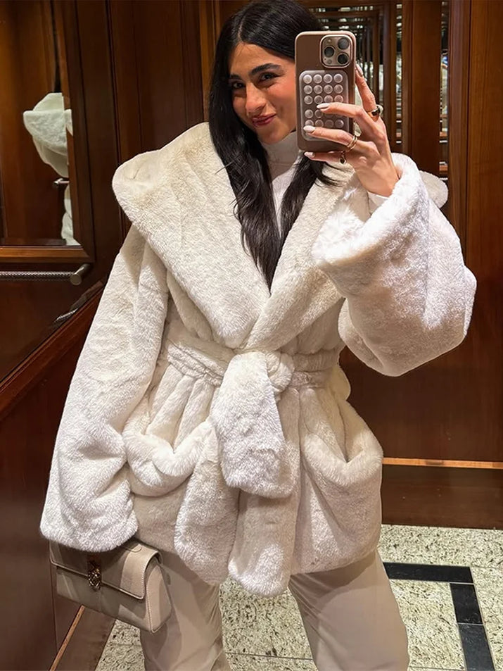Hooded Lace Up Faux Fur Coats Women Luxury Long Sleeve Slim Solid Autumn Winter Coat New Bomber Jacket Fashion Ladies Outerwears