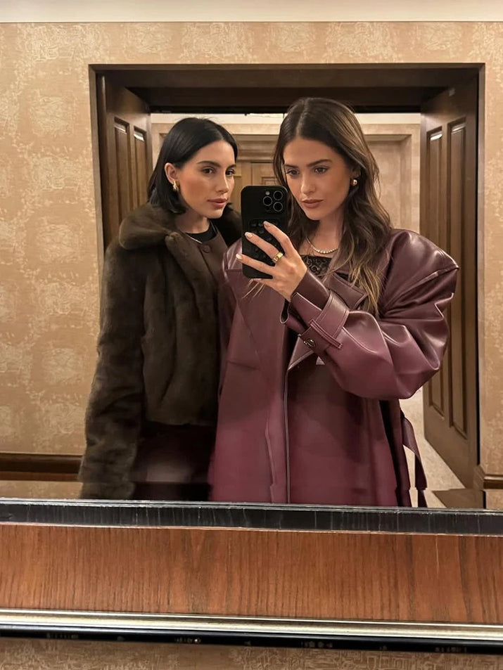 Lace Up Retro Leather Longtrench Coat Women's Fashion Burgundy Lapel Loose Outerwear 2025 New Fall Daily Commute Street Coats