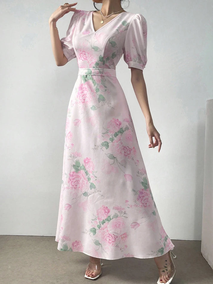 Rafiah Women's Summer Pink Floral Print V-Neck Short Sleeve Maxi Dress 2025 Puffed Sleeves Ruffled Hem Casual Elegant Wear