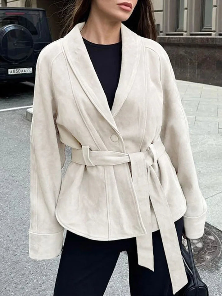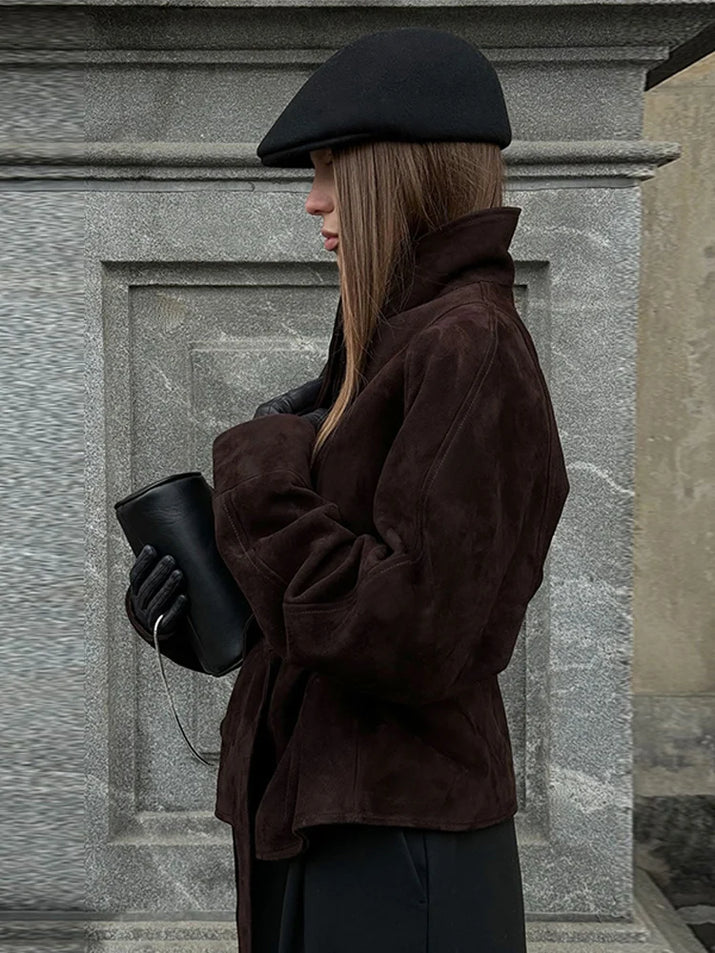 Stand Collar Suede Sashes Jackets Women Vintage Long Sleeves Button Lace Up Slim Coats New Fashion Early Autumn Ladies Outerwear