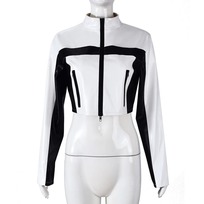 Women's Black White PU Paneled Cropped Jackets Punk Grunge Zipper Slim Y2K Clothes 2025 Fall Moto Biker Casual Y2K Coat